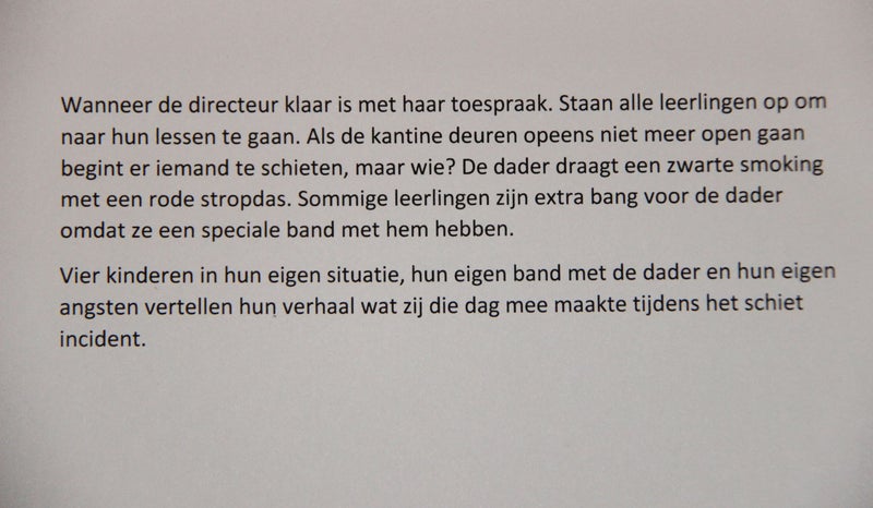 Ik vond het een best moeilijk boek om te begrijpen omdat er steeds verwisseld werd van persoon. Je moest daarom even goed nadenken waar het overgaat bij die persoon. Dit vond ik best verwarrend in het begin. Het boek las wel makkelijk door als je eenmaal door had over welk persoon het ging en voor je het wist was je alweer een hoofdstuk verder. Er zaten ook steeds berichtjes tussen op het internet van familie of vrienden van de leerlingen. Dit had van mij niet gehoeven omdat het verder niet echt iets toevoegde aan het verhaal. In het boek zijn best wel veel mensen vermoord. Hierdoor vond ik het niet perse spannend of eng. Ik had wel de hele tijd dat ik dacht van nog 1 hoofdstuk maar dat werden er dan gauw al 2 of 3. Het boek is indrukwekkend omdat de schrijfster het boek heeft gebaseerd op een schiet partij op een school in Amerika in 2012. Daardoor had ik ook wel steeds de gedachte dat het ongeveer echt gebeurd was. Ik zou het boek niet nog een keer lezen omdat ik denk dat romans niet mijn boeken zijn.